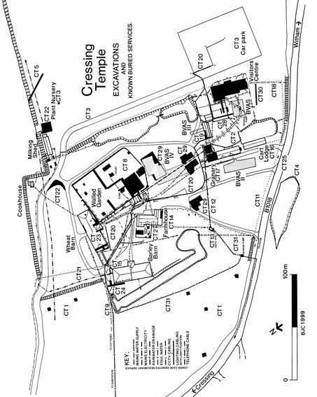 2b. The layout of Cressing Temple in 1999 with the positions of the known services and archaeological excavations.